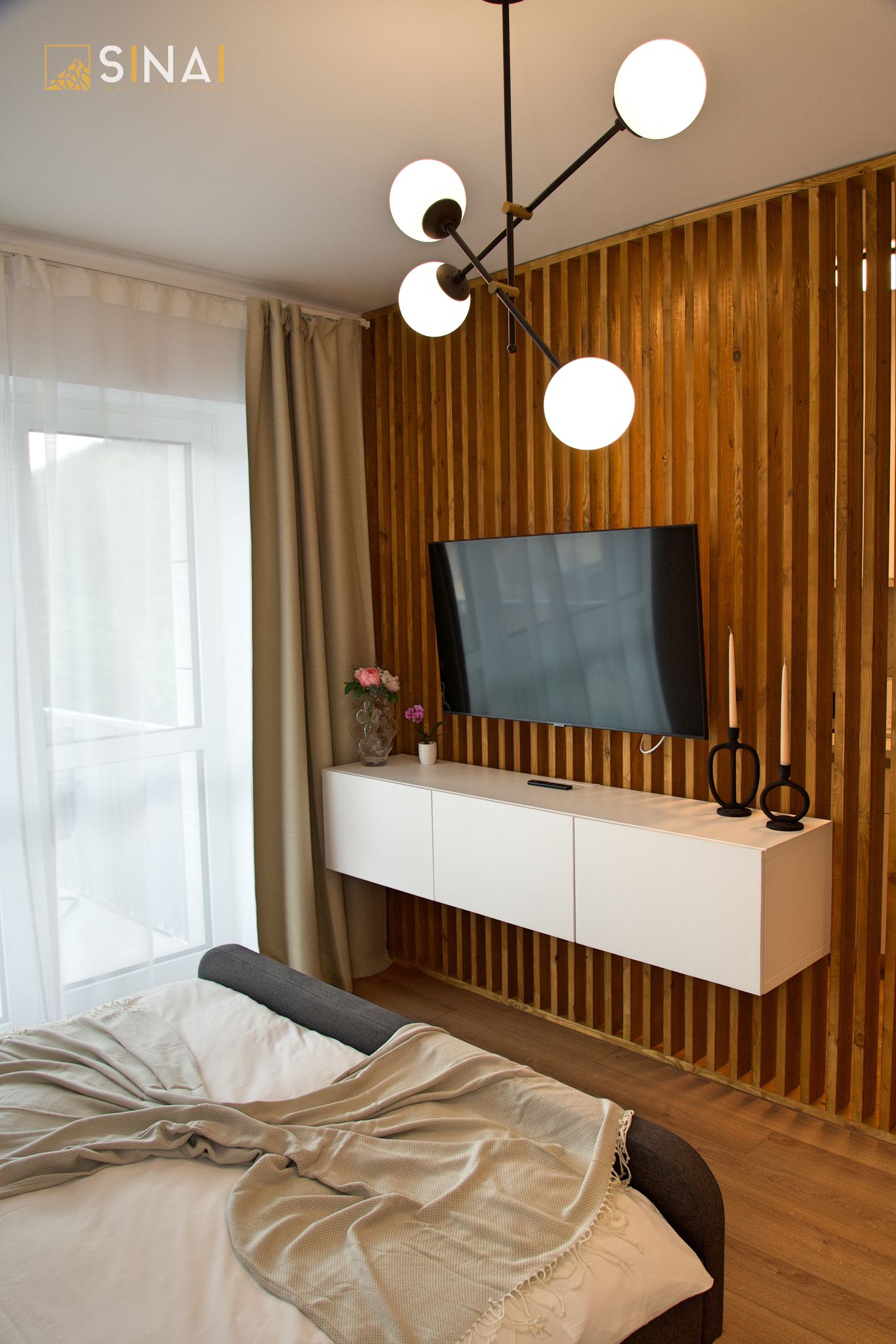 - Pat matrimonial: Invită la odihnă și relaxare, fiind centrul confortului în acest spațiu.